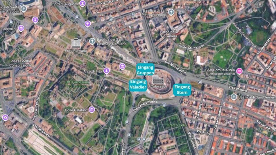 - Valadier-Eingang (Südwestseite, nahe Konstantinsbogen) → für die meisten Besucher (alle Tickets außer "24 Only Arena)