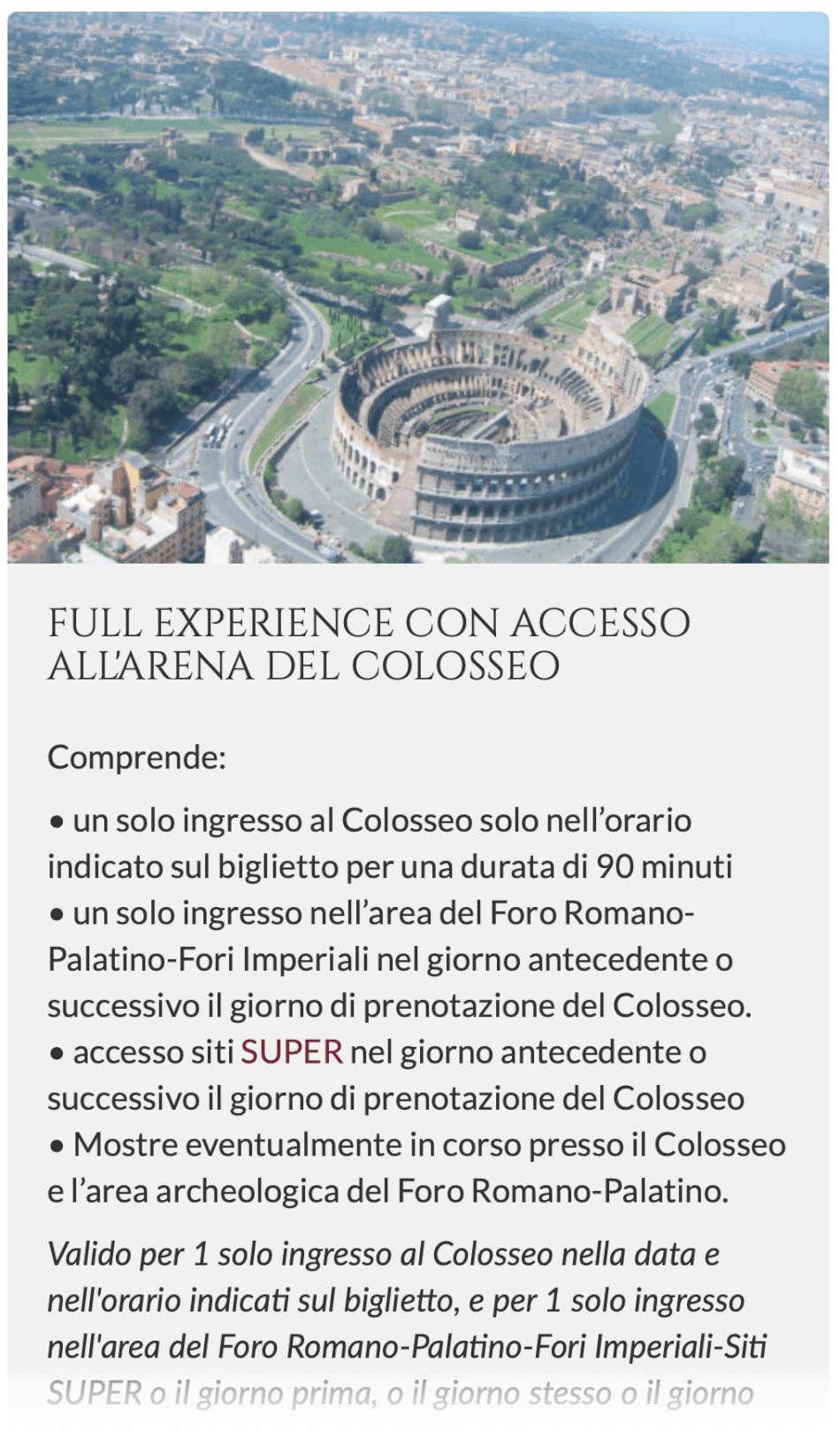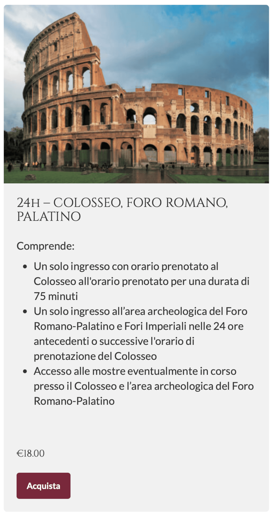 - einmaligen Zugang zum Kolosseum (1. und 2. Rang sowie Ausstellung) am gebuchten Tag zur gebuchten Uhrzeit (Zeitfenster: ±15 Minuten)
